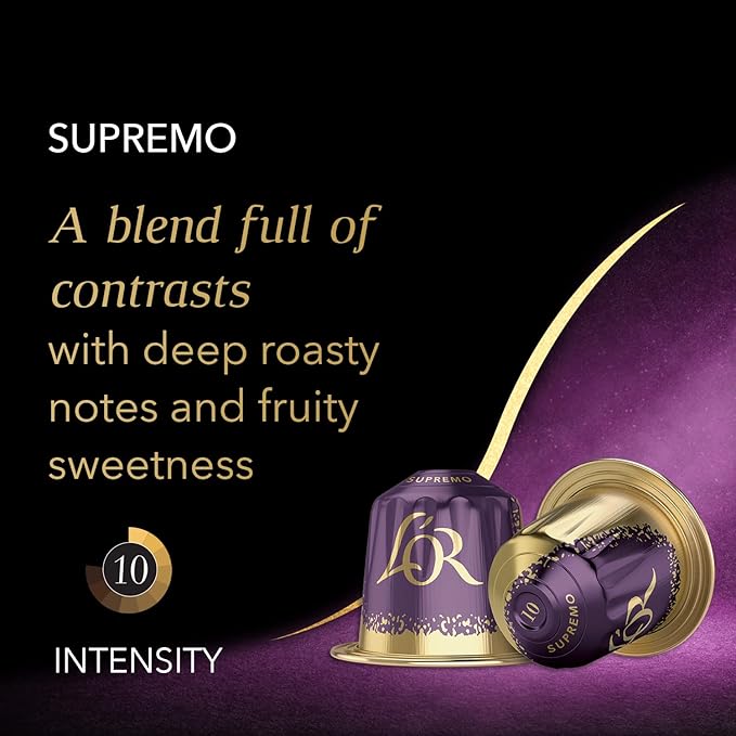 تقدم كبسولات L'OR إسبرسو سوبريمو تجربة إسبرسو غنية ومكثفة تأسر الحواس. مصنوعة من أفضل حبوب أرابيكا وروبوستا، توفر هذه الكبسولات نكهة قوية وغنية مع نغمات محمصة داكنة ولمسات من التوابل. يعد مزيج سوبريمو مثاليًا لأولئك الذين يستمتعون بالقهوة القوية والجريئة مع ملف نكهة راقٍ. تم تصميم كل كبسولة لتكون متوافقة تمامًا مع ماكينات القهوة Nespresso®*، مما يضمن عملية تخمير سلسة. استمتع بالرائحة الفاخرة والنكهة القوية لكبسولات L'OR إسبرسو سوبريمو، المثالية لزيادة الطاقة في الصباح أو للاستمتاع بوقت استراحة فاخر بعد الظهر.
