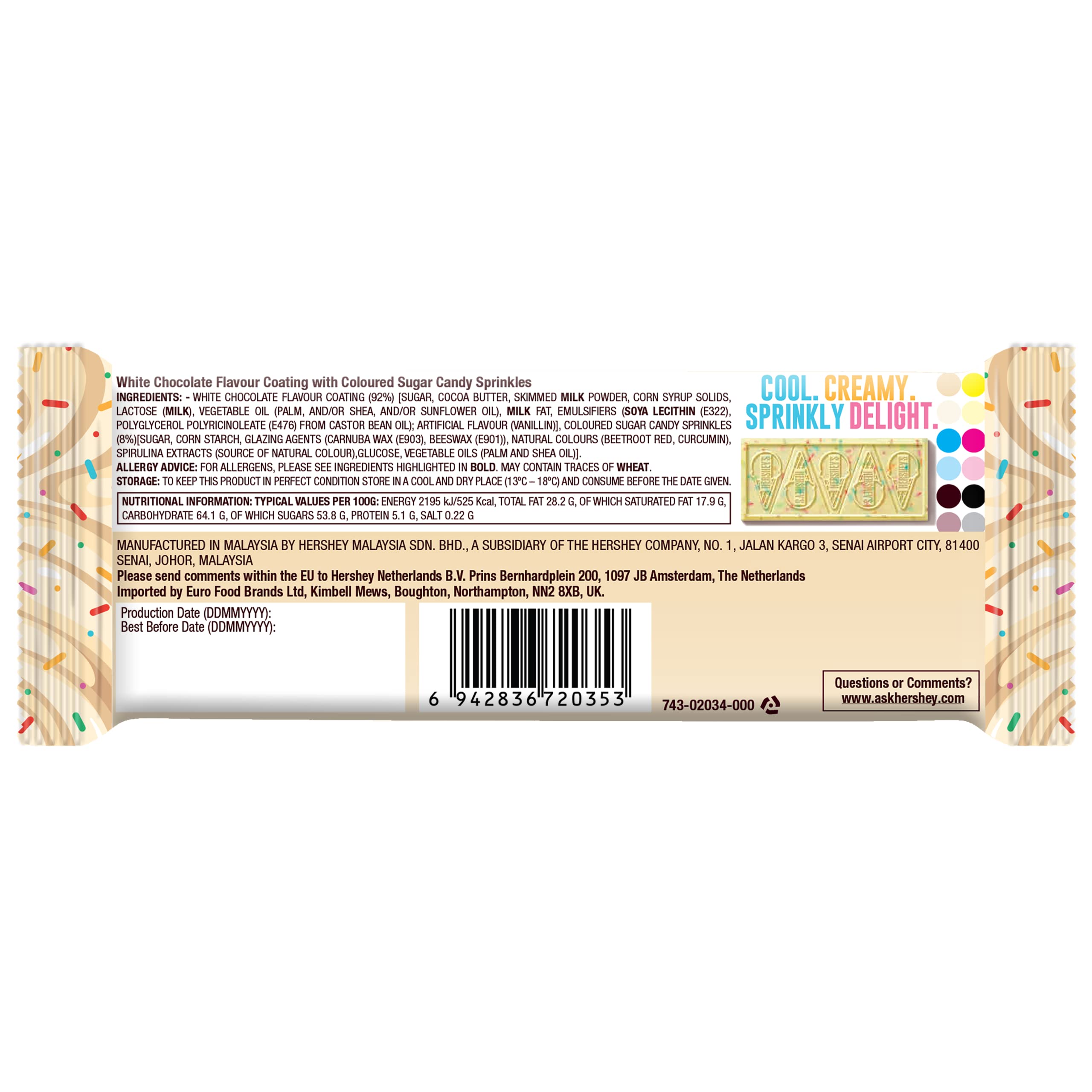 - Creamy white chocolate with colorful sprinkles
