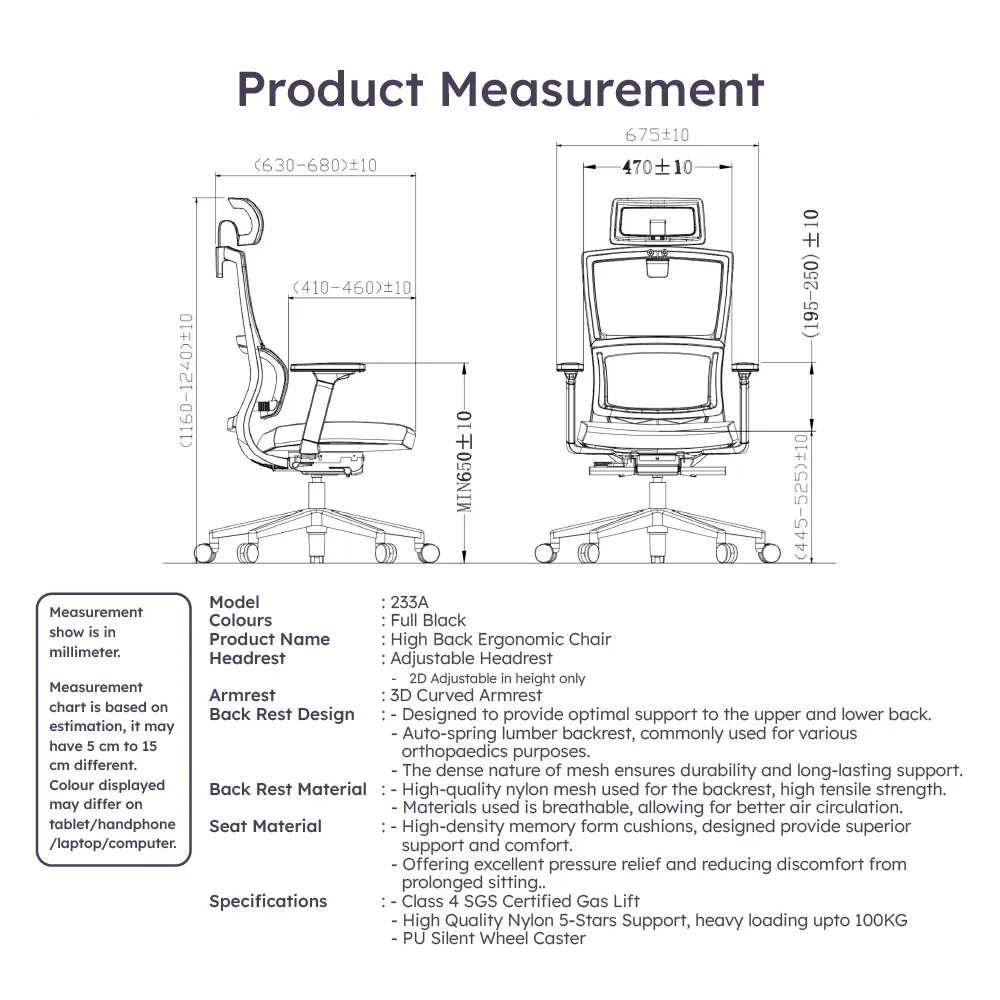 - High-Back Ergonomic Design: Adjustable headrest and lumbar support for proper posture.