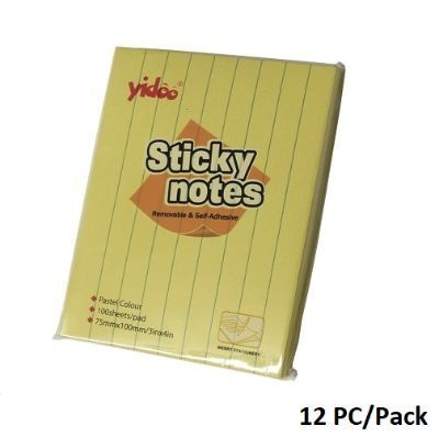 YIDOO yellow lined sticky notes, sized 75x100mm, with 100 sheets per pad. Comes in a pack of 12, perfect for organized note-taking, reminders, and lists. Strong adhesive ensures notes stay secure and can be repositioned easily.