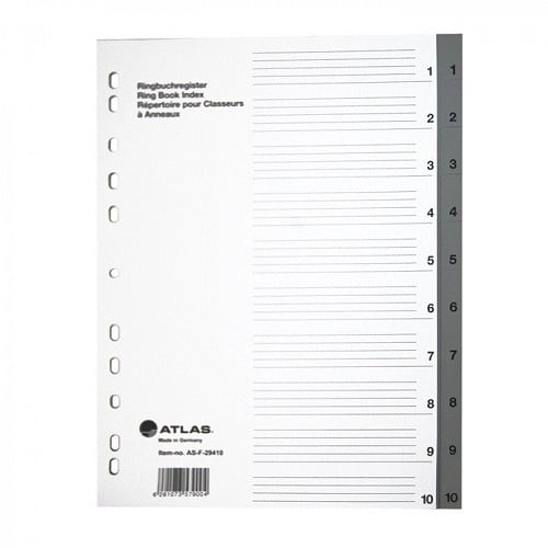 The ATLAS Gray Plastic Index Divider, A4, 1-31 Numbers, 10 PC/Pack offers a practical and efficient way to organize and navigate your documents. Crafted from durable plastic material, these dividers ensure long-lasting use, even in busy office environments.