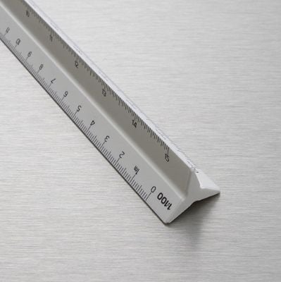 - التصميم: مسطرة مثلثة بستة مقاييس مختلفة للقياس.